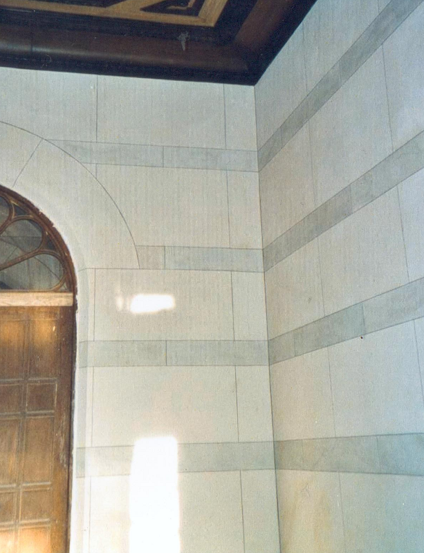 Eine leichte Lasur wird nicht vollflächig sondern in leichten Äderungen über vorher abgegrenzte Quaderbereiche gezogen. Hier sogar zweifarbig auf Silikatbasis.